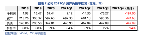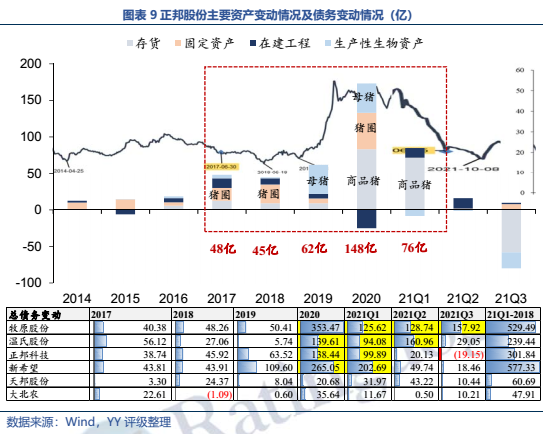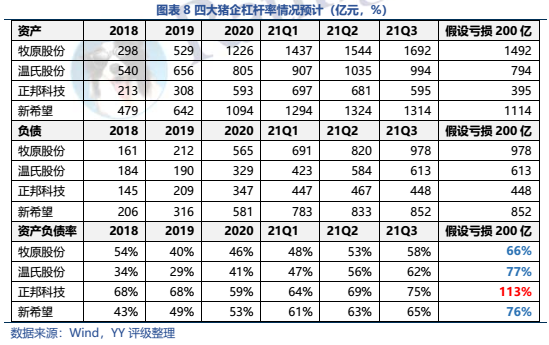 公司本就規(guī)模小、杠桿率高、前期累計的利潤少,先天底子薄,而公司又踏錯周期,20-21Q1高位繼續(xù)激進擴張,進一步積累了債務負擔。當 2021年2季度豬肉價格急速下滑后,公司的報表全面惡化,預計21年末資產(chǎn)負債率將突破90%,凈資產(chǎn)僅剩27億左右,陷入財務危機中。