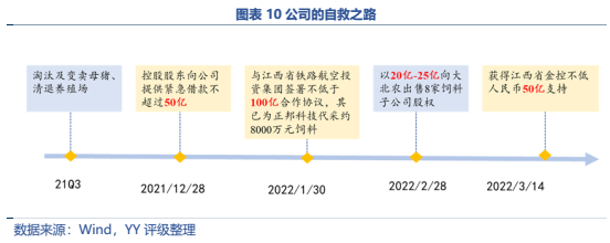 財務逐步惡化后,公司通過賣母豬、賣資產(chǎn)努力斷臂求生,后又積極尋求股東、外部政府的援助,可用之牌都打了一遍,目前已經(jīng)獲得200億左右的外部支援,本輪周期預計可以熬過,僅存的0.6億信用債大概率可以償付。