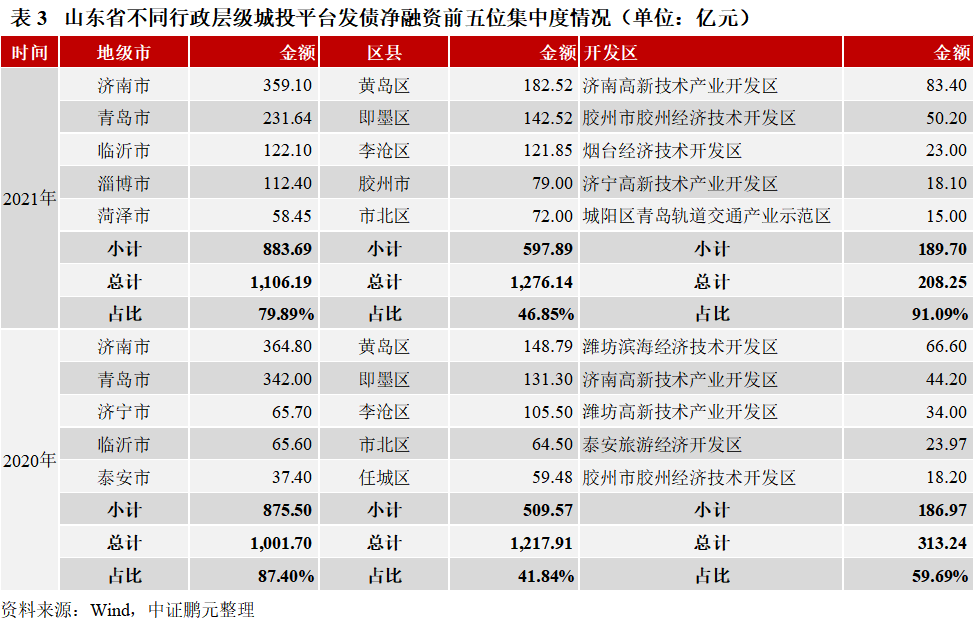此外,從不同層級(jí)的凈融資集中度來(lái)看,與2020年相比,2021年區(qū)縣和開發(fā)區(qū)級(jí)別的城投主體前五位合計(jì)占比有所提升,地市級(jí)城投主體的凈融資前五位合計(jì)占比有所下降,集中度分化較大。