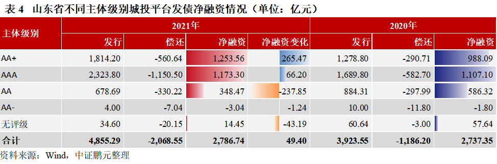 (2)高行政層級(jí)、高評(píng)級(jí)主體發(fā)行規(guī)模占比增加,弱資質(zhì)平臺(tái)增速下降明顯。2021年山東省高行政層級(jí)主體城投債發(fā)行規(guī)模占比增加且同比增速相對(duì)更高、增速放緩程度也更小,區(qū)縣主體發(fā)行增速大幅下滑。高級(jí)別主體城投債發(fā)行規(guī)模占比提升,同比增速表現(xiàn)更為穩(wěn)健,同時(shí)也是拉動(dòng)凈融資增長(zhǎng)的主要?jiǎng)恿Α?/p>