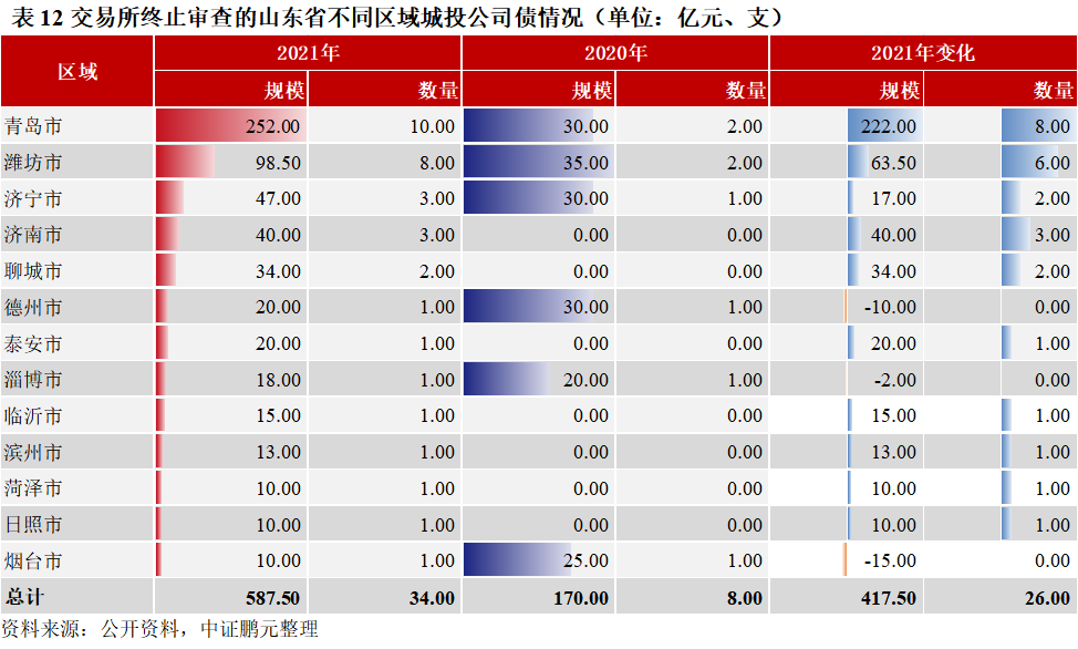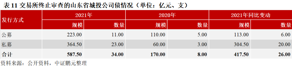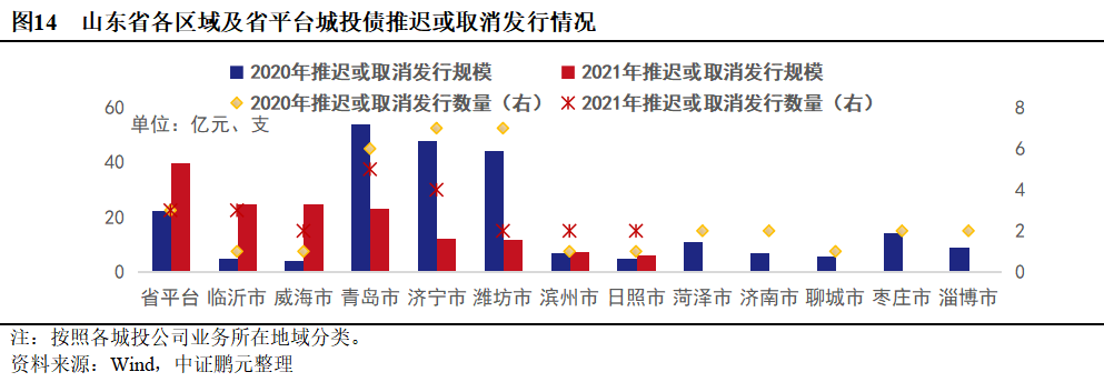 (5)交易所終止審查項(xiàng)目大幅增加,地區(qū)整體債務(wù)水平偏高區(qū)域推遲或取消發(fā)行債券更多。2021年山東省在交易所終止的公司債項(xiàng)目大幅增加,私募債受影響更大,青島和濰坊數(shù)量居前。推遲或取消發(fā)行的城投債數(shù)量和規(guī)模較上年均有下降,地區(qū)整體債務(wù)水平偏高區(qū)域多發(fā)。