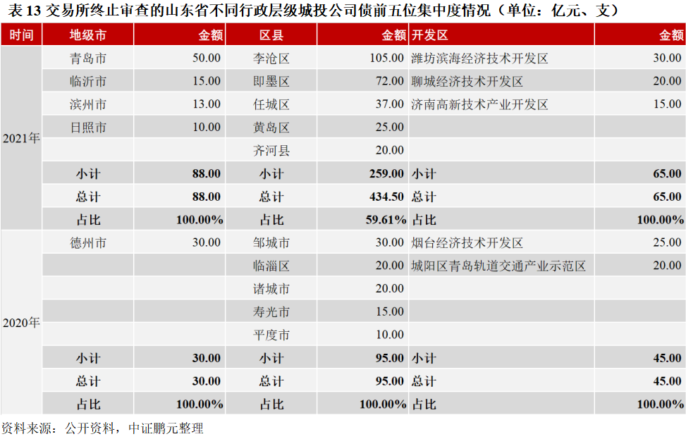 2021年交易所顯示為終止?fàn)顟B(tài)的山東城投公司債規(guī)模合計(jì)587.50億元,數(shù)量合計(jì)34支,分別較2020年增長(zhǎng)417.50億元和26支。從季度數(shù)據(jù)來(lái)看,2021年第一季度終止的規(guī)模和數(shù)量開始環(huán)比大幅增加,隨后第二季度和第三季度有所下降但仍高于往年水平。受城投債監(jiān)管政策持續(xù)收緊的影響,四季度公司債終止項(xiàng)目再次攀升。從發(fā)行方式看,與2020年不同的是,2021年私募債終止占比更高,自交易所監(jiān)管政策收緊以來(lái)受影響也更大。從地區(qū)數(shù)據(jù)看,青島終止債券的規(guī)模最大且數(shù)量最多,其次是濰坊。從不同層級(jí)集中度來(lái)看,2021年終止項(xiàng)目更為分散,影響更為廣泛。