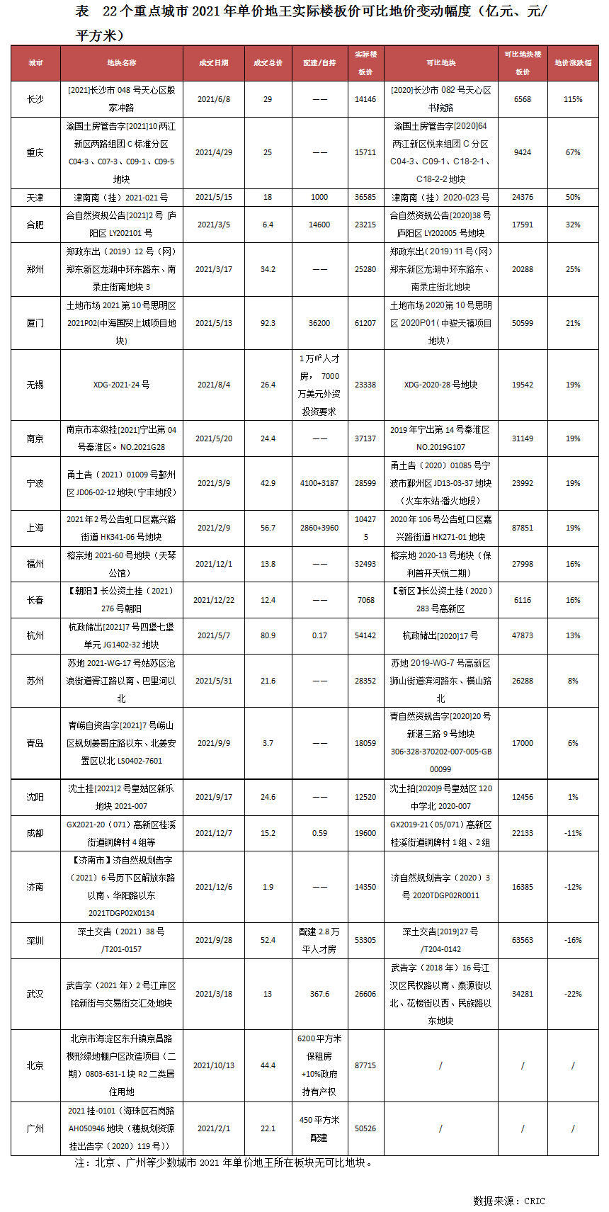 事實上,大部分地王樓板價的上漲是受到附加條件的影響(配建或自持),譬如,天津、合肥、廈門、無錫、寧波、上海和杭州等,2021年單價地王實際樓板價較2020年周邊同類地塊均有不同程度的上升。典型如無錫,濱湖區XDG-2021-24號(和璽南地塊)經過搖號由輝廣競得,成交樓面價19500元/㎡,該地需配建1萬㎡人才房,還有7000萬美元外資投資要求,實際樓板價增至23338元/平方米,較2020年單價地王樓板價19542元/平方米增幅高達19%。