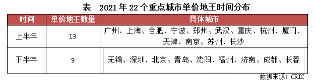 單就22個重點城市2021年度單價地王成交時間來看,有13個城市單價地王成交在上半年,僅有9個是在下半年成交的。究其原因,主要是由于下半年二、三批次集中供地,熱點城市紛紛加強了溢價、地價管控,加之房企融資環境收緊,市場熱度均維系在低位,高價地成交數量隨之減少,因此年度單價地王數量也明顯減少。