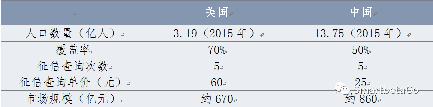 以對人口的覆蓋率來預測,目前美國征信市場規模約為670億元,而我國個人征信行業進入高速發展期后,征信服務人口覆蓋率預計能夠達到50%,以每人每年查詢個人征信報告的次數為5次,央行征信中心個人報告查詢服務的單價為25元,推算我國征信市場未來的規模約860億元,極有可能超越美國成為全球最大征信市場。