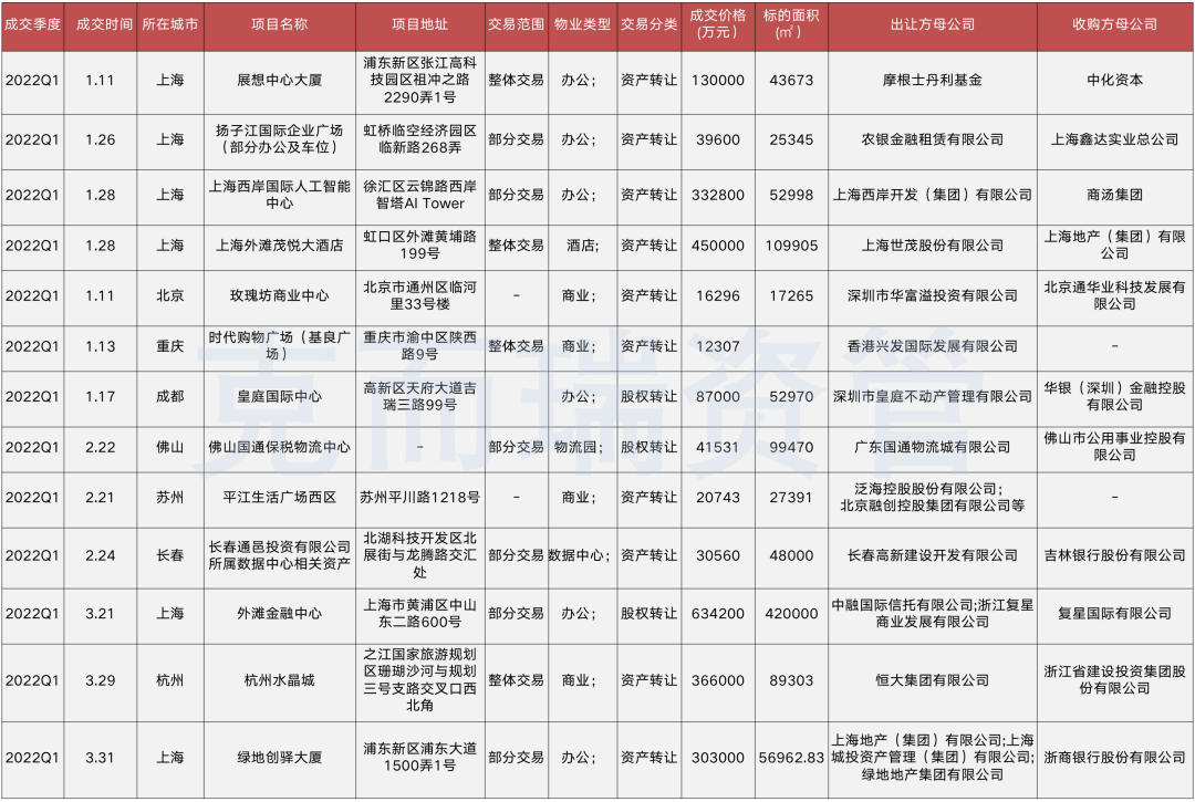 單月來看,3月有多宗房企項目成交,浙商銀行以30.3億元購置綠地控股旗下位于浦東的創驛大廈,作為其在滬機構發展辦公使用;位于杭州且2012年開始規劃,至今仍未完工的恒大水晶城商業項目以36.6億元成交,浙江建投為收購主體,此舉目的為加快化解其與恒大集團及下屬公司應收款項逾期問題。