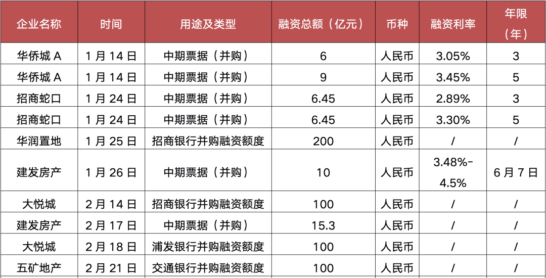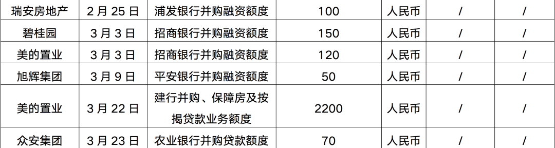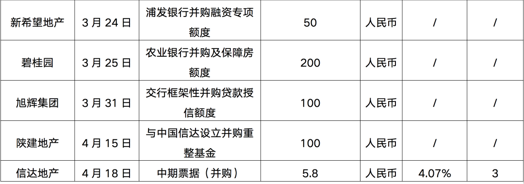 在此同時,針對出險企業的并購融資,政策也給予了較大程度的支持,3月以來更多的房企與金融機構建立了并購融資協議,獲得并購融資額度,除了華僑城、招商蛇口、建發房產、華潤置地、大悅城等央企國企發行并購中期票據成功或者獲批并購融資額度之外,另有旭輝、五礦地產、碧桂園、美的置業、新希望地產等民營企業并購融資額度獲批。