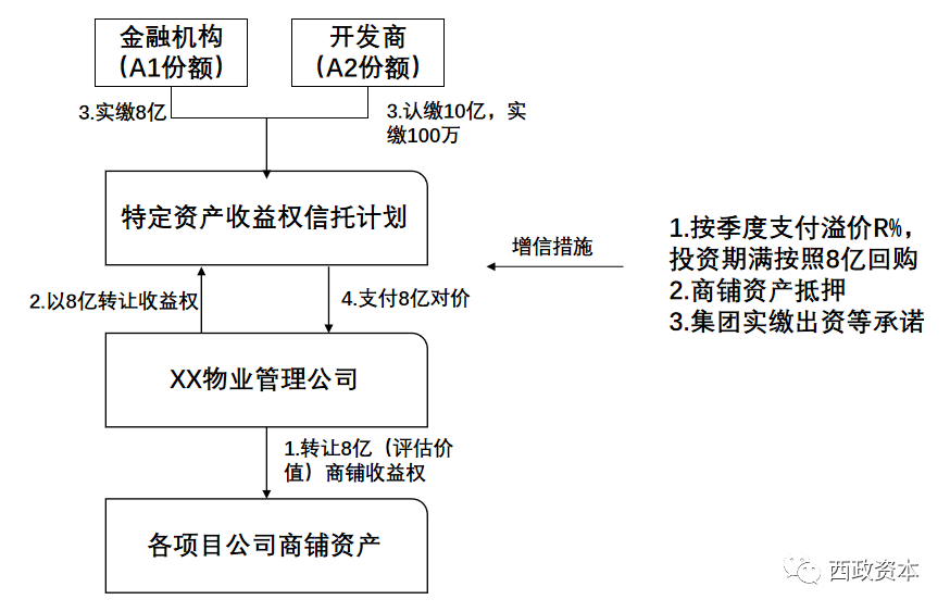 以上述產(chǎn)品架構(gòu)為例,項(xiàng)目公司把未售商鋪的收益權(quán)轉(zhuǎn)讓給物業(yè)管理公司,并簽署《商鋪收益權(quán)轉(zhuǎn)讓協(xié)議》;物業(yè)管理公司將商鋪收益權(quán)轉(zhuǎn)讓給信托計(jì)劃,并與信托計(jì)劃簽署《特定資產(chǎn)收益權(quán)轉(zhuǎn)讓及回購協(xié)議》,其中約定由物業(yè)公司負(fù)責(zé)對(duì)商鋪進(jìn)行銷售和經(jīng)營,支付固定回報(bào),并承諾到期后回購商鋪收益權(quán);信托計(jì)劃到期后,信托計(jì)劃管理人可發(fā)繳款指令給開發(fā)商追加資金,用于回購商鋪及收益權(quán),也即信托計(jì)劃到期后無法退出時(shí),開發(fā)商需就認(rèn)繳的份額完成資金的實(shí)繳,由此保障信托計(jì)劃的退出。