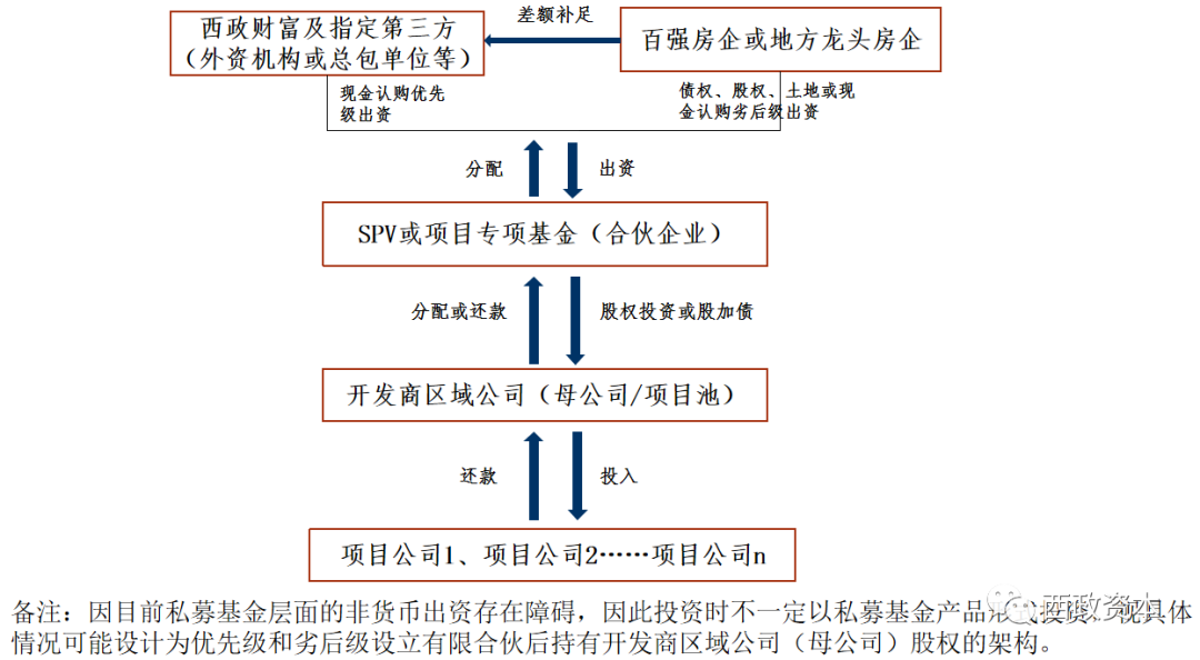 以上述融資架構(gòu)為例,因總包單位的前融配資一般不涉及到開發(fā)商自有資金的配比和出資的問題,因此我們在做融資架構(gòu)時(shí)對(duì)于開發(fā)商出資的部分一般都會(huì)以比較靈活的方式進(jìn)行處理。在上述架構(gòu)中,我們安排總包施工單位以現(xiàn)金認(rèn)購優(yōu)先級(jí)出資,開發(fā)商以債權(quán)、股權(quán)、土地等認(rèn)購劣后級(jí)出資,優(yōu)先與劣后級(jí)出資完成后總包資金注入SPV(或合伙企業(yè)),SPV(或合伙企業(yè))以“股+債”方式將資金繼續(xù)注入開發(fā)商區(qū)域公司(母公司),區(qū)域公司隨后將資金注入?yún)⑴c土地競拍或有在建項(xiàng)目的各個(gè)項(xiàng)目公司,資金最終用于繳納土地款或項(xiàng)目的開發(fā)建設(shè)。