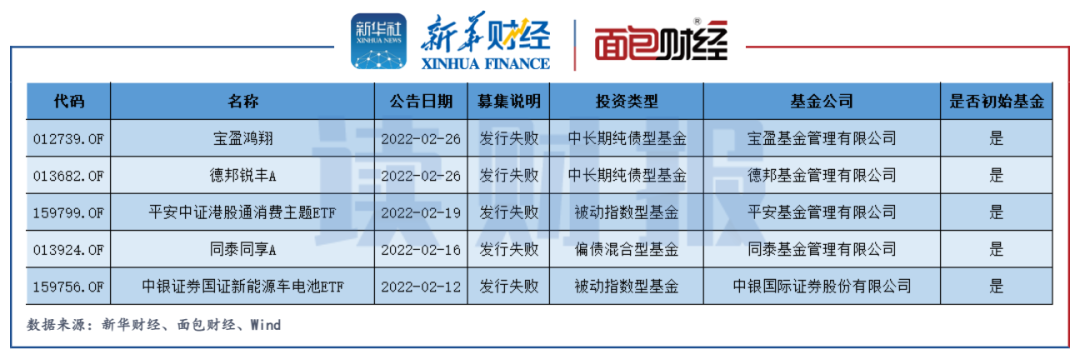 以公告日統計,2022年前兩個月累計已有5只公募基金產品發行失敗(初始基金口徑),包括寶盈鴻翔、德邦銳豐A、平安中證港股通消費主題ETF、同泰同享A、中銀證券國證新能源車電池ETF。這5只產品中,2只屬于中長期純債型基金、2只屬于被動指數型基金、另外1只屬于偏債混合型基金。