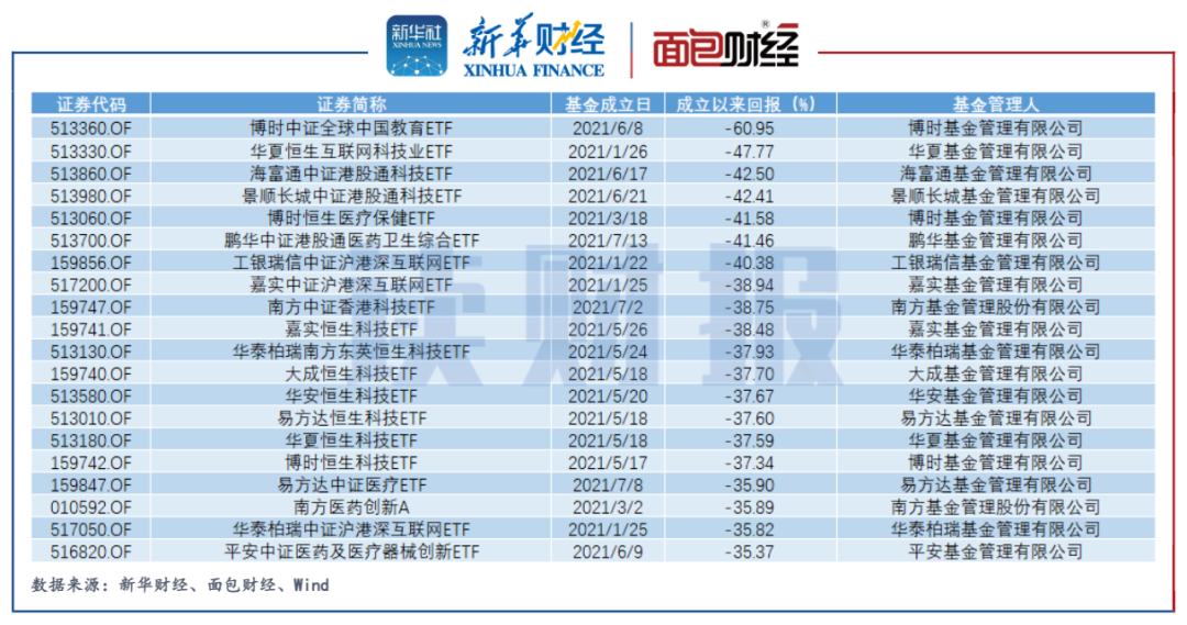 2021年以來成立的基金中,截至今年2月28日,已經有超過30只基金的虧損幅度超過30%。其中,博時基金、華夏基金、華泰柏瑞基金各占4只,數量明顯領先其他基金公司。