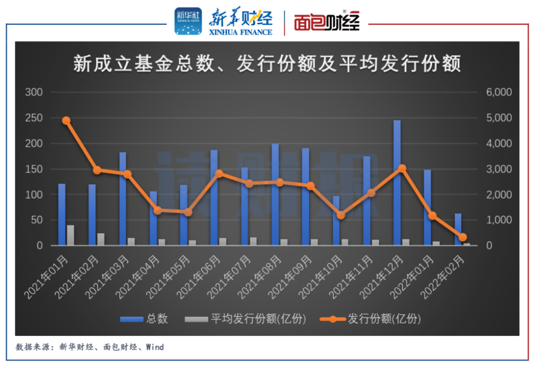 圖4:2021年1月至2022年2月新基金成立總數、發行份額及平均發行份額