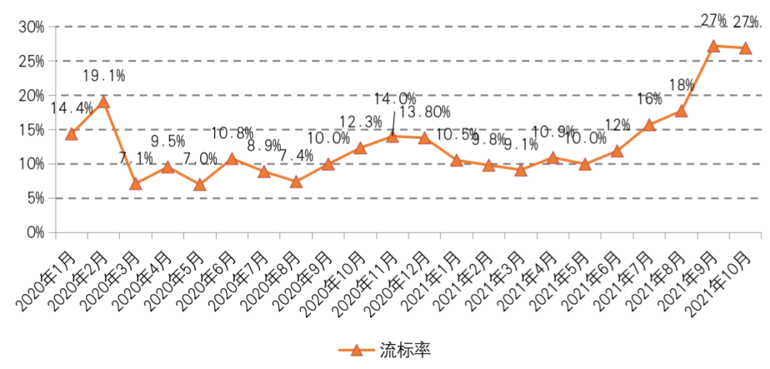在此影響下,2021年10月成交溢價率較上月進一步走低,環比減少0.9個百分點,降至3.3%,再創下2020年以來的最低值。