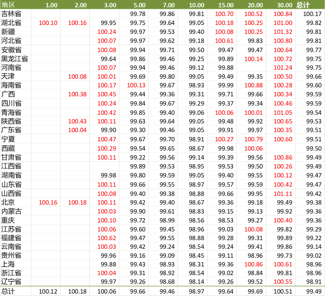 從數據上來看,1年、2年、3年和30年期的地方政府債,上市后的首日均價超過了100元,達到了“買到即是賺到”的效果。其中新疆發行的30年期地方政府債,成為性價比之王,上市首日的平均凈價達到了101.32。