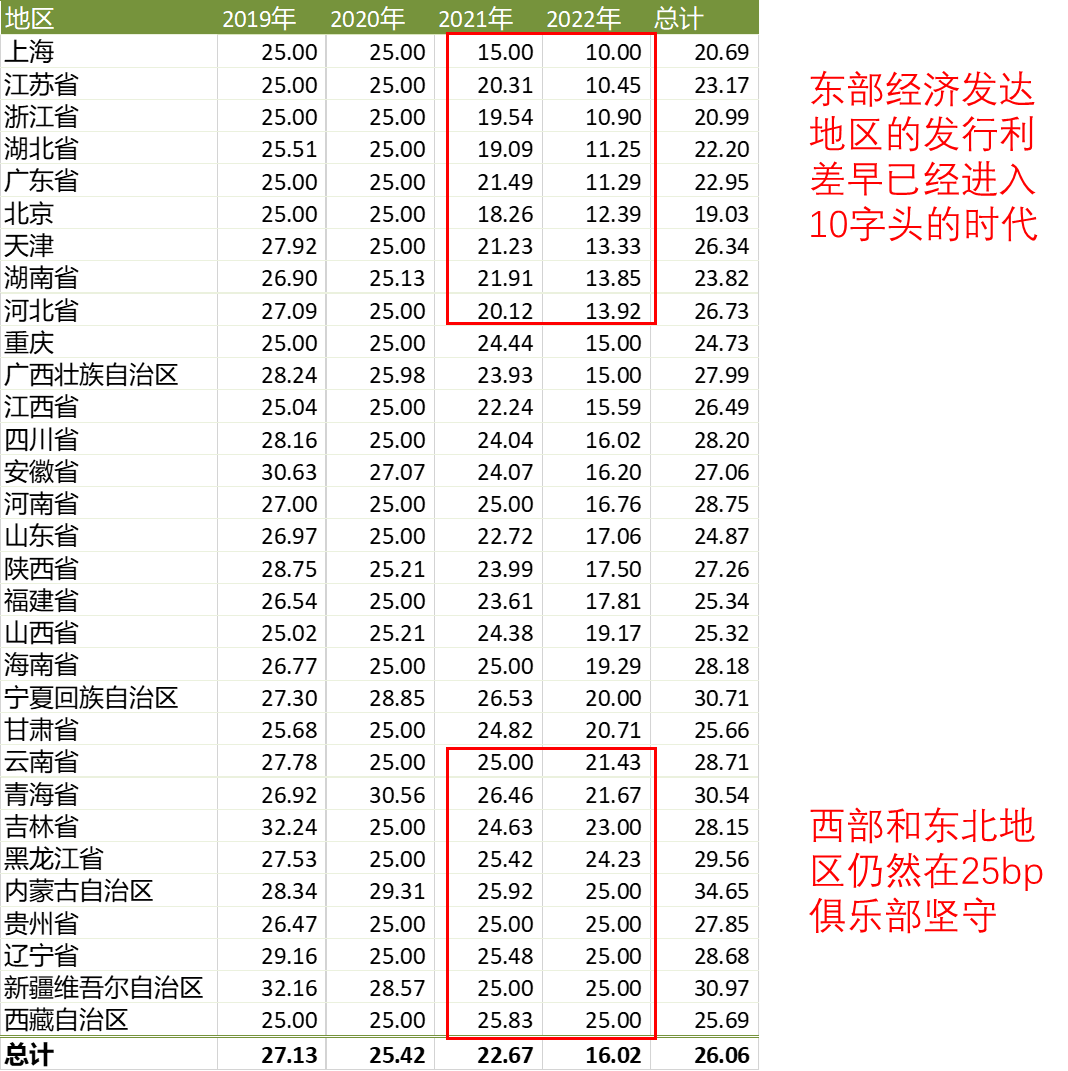 但同時看到,東北和西部地區的省份仍然在堅持著25bp的底線,成為證券公司銷售交易部門眼中的香餑餑,畢竟一上市就賺錢的券,誰不愛呢?