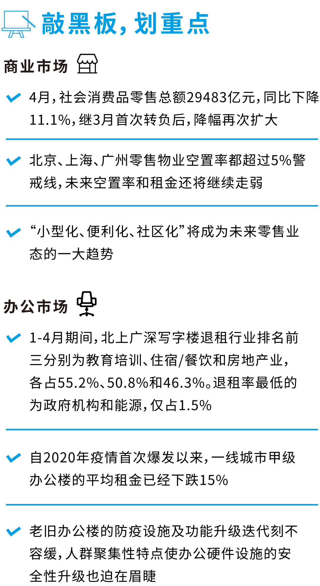 辦公市場,老舊辦公樓的防疫設施及功能升級迭代刻不容緩,人群聚集性特點使辦公硬件設施的安全性升級也迫在眉睫。同時租戶對辦公空間靈活性和復合性的需求更高,智慧辦公會有更廣闊的前景。
