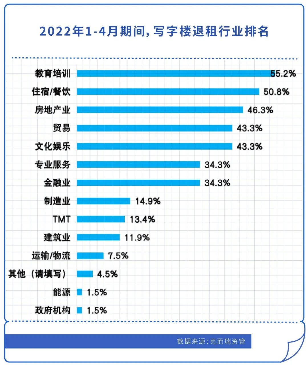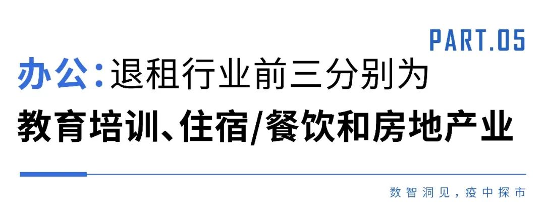 疫情期間,克而瑞資管在北上廣深等一線城市的抽樣調研數據顯示,1-4月,寫字樓退租行業排名前三分別為教育培訓、住宿/餐飲和房地產業,各占55.2%、50.8%和46.3%。退租率最低的為政府機構和能源,僅占1.5%。