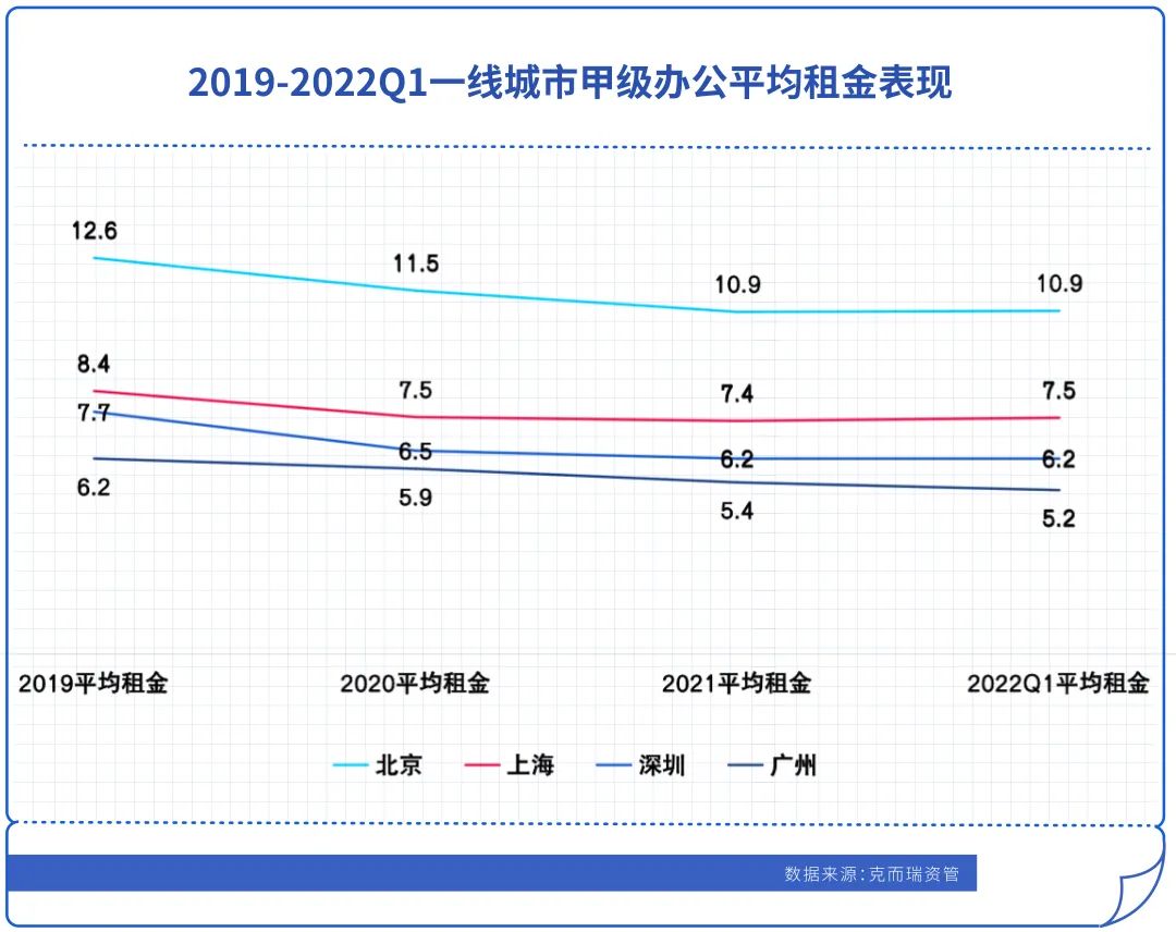 2020年初爆發疫情,2019年末至2021近兩年一線城市的甲級辦公平均租金持續走低,北上廣均下降13%左右,深圳降幅最大為19.5%。