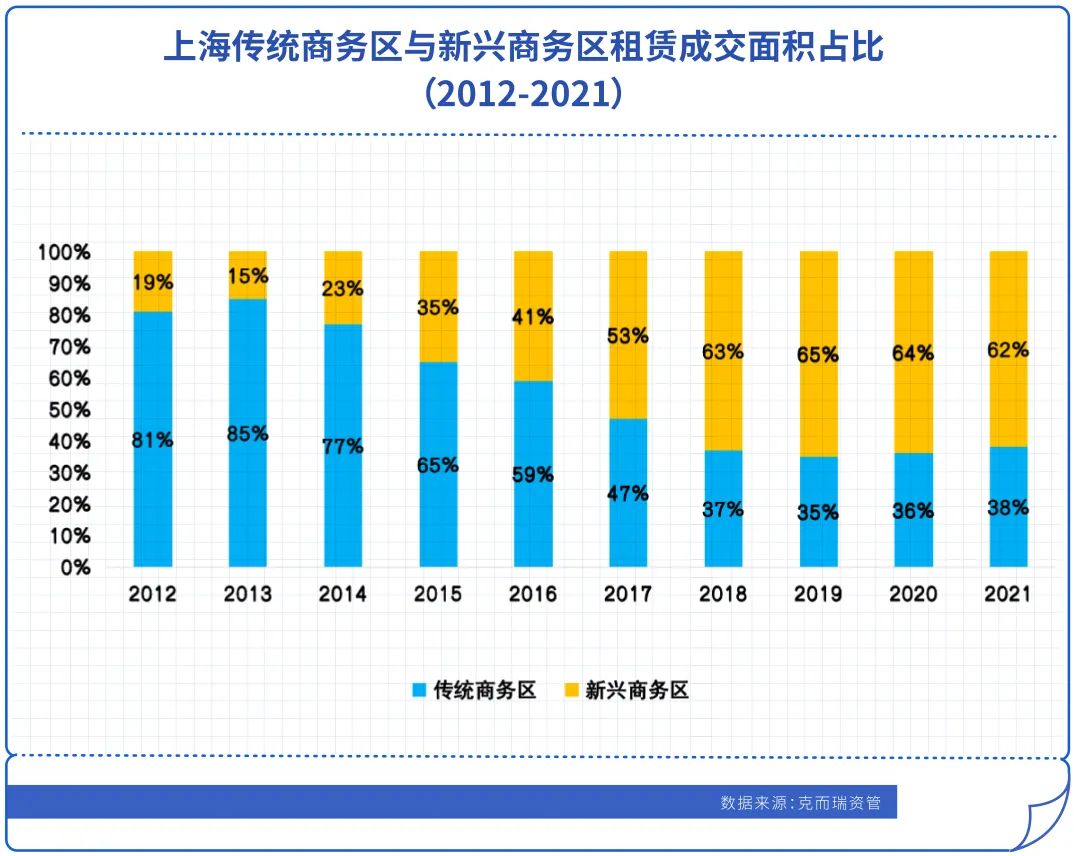 以上海為例,傳統商務區與新興商務區的平均租金比值由2019年的1.7下降至2021年的1.5;2019年起,新興商務區的成交占比已穩定在6成以上。