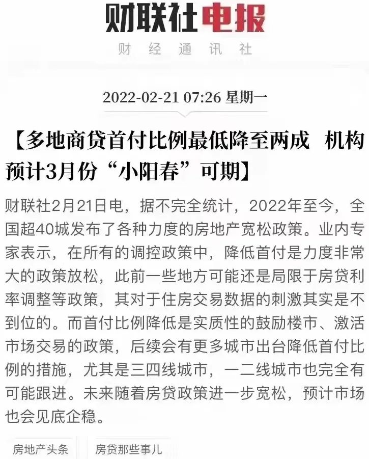 4、因城施策降低首付等還會很多,不值得驚訝。上周媒體報道,山東菏澤工行、建行、農行自 2月14日起,名下無住房且無個人住房貸款記錄的購房者,首付比例可執行20%。