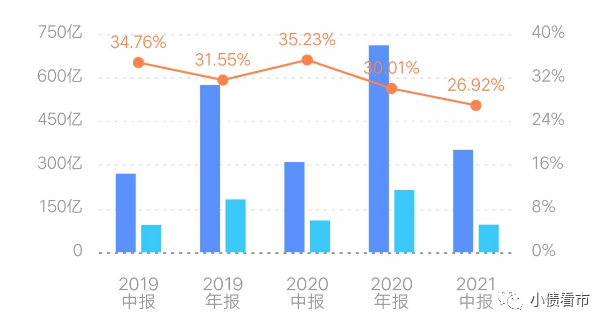 近年來(lái),受結(jié)轉(zhuǎn)項(xiàng)目區(qū)域分布影響,龍光集團(tuán)整體營(yíng)業(yè)毛利率呈下行趨勢(shì),2021年中期降至26.92%。