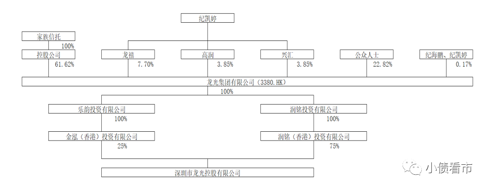 從股權(quán)結(jié)構(gòu)看,紀(jì)海鵬和女兒紀(jì)凱婷通過(guò)家族信托實(shí)際控制龍光集團(tuán),是龍光實(shí)際控制人。