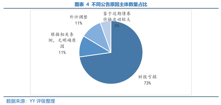 總體來看,公告后主體層面出現展期或者實質違約情況的有11個,主體數量占比20%,涉及債券48只,債券數量占比39.7%;主體YY評級在公告后下調涉及的主體數量26個,主體數量占比47.3%。公告后,也有部分主體信用資質變好的情況,主體YY評級在公告后上調主要涉及山東魏橋,隨著行業周期修復,信用資質有明顯改善,主體數量占比1.8%。
