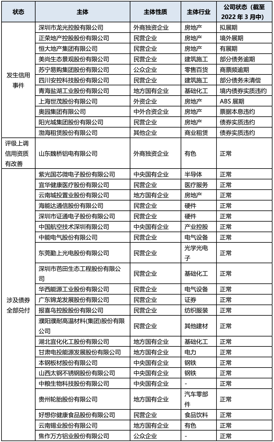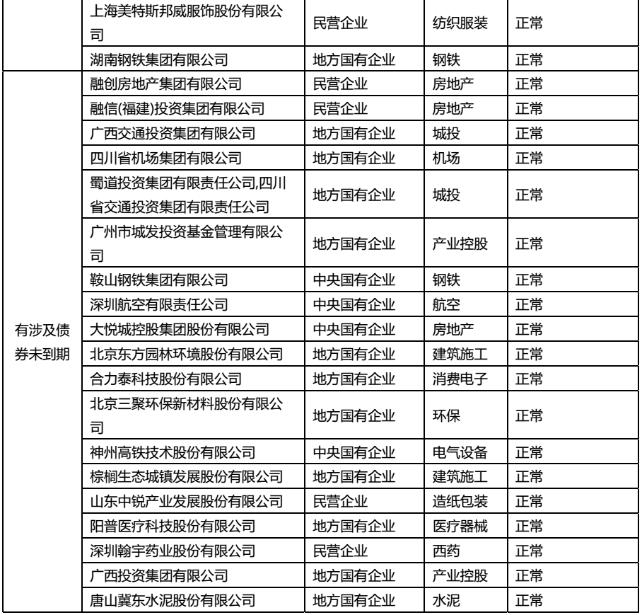除如上主體層面出現信用事件的,目前主體狀態正常的,并在公告后涉及債券全部兌付完畢的主體有24個,數量占比43.6%,包括紫光國微、宜華健康、云南城投、海能達、證通電子、中國航空技術、中能電氣、東莞勤上、芭田生態、華西能源、錦龍發展、報喜鳥、濮陽濮耐、湖北宜化、甘肅電投、本鋼板材、山西太鋼、中糧生物、貴州輪胎、好想你、云南錫業、焦作萬方、美特斯邦威服飾、湖南鋼鐵。