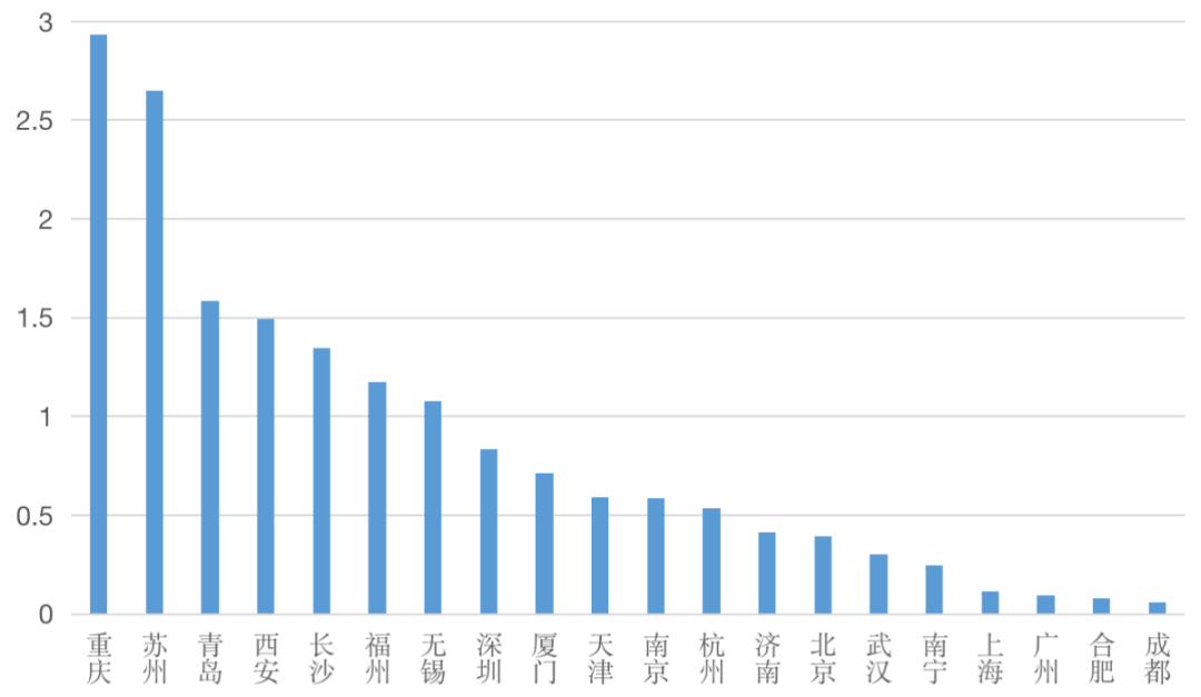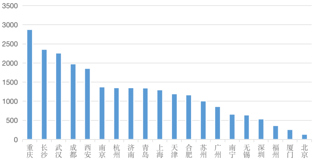 從數(shù)據(jù)看,重慶、長沙、武漢、成都等中西部城市表現(xiàn)依然強勁,重慶成交規(guī)模2877萬平方米居首位。隨著項目的建設交付,這些項目將在未來一年轉(zhuǎn)化為該城市企業(yè)拓展的對象,重慶新項目規(guī)模將進一步與其他城市拉開差距。
