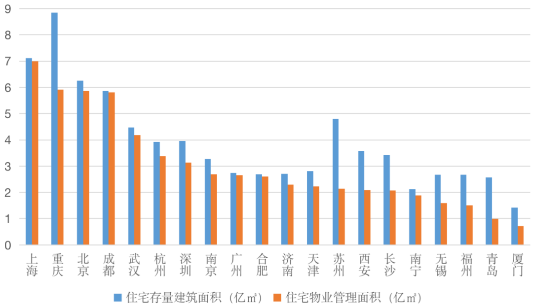 二線城市中,中西部城市成都和武漢市場規(guī)模也較為突出,住宅物業(yè)管理規(guī)模也已躋身全國前五位,住宅物業(yè)管理規(guī)模均超過5億平方米.
