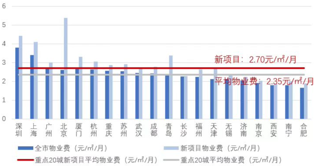 根據(jù)克而瑞物管監(jiān)測,重點20城平均物業(yè)費為2.35元/平方米/月,而樓齡5年及以下的項目平均物業(yè)費為2.7元/平方米/月,相較于平均水平高出15%。