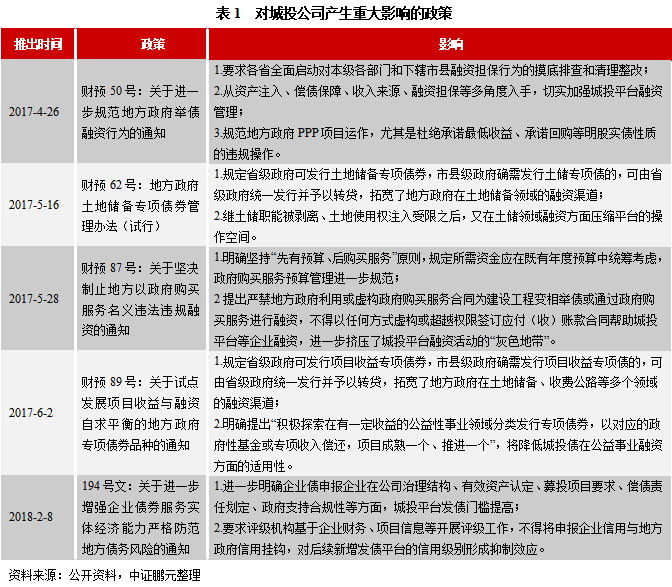 本文認為:市場各方對該段表述反應過度了。原因在于,相似的表述在2018年9月13日《關于加強國有企業資產負債約束的指導意見》(以下簡稱“《意見》”)中曾出現過。《意見》第五部分第五條明確指出:“對嚴重資不抵債失去清償能力的地方政府融資平臺公司,依法實施破產重整或清算,堅決防止‘大而不能倒”’,堅決防止風險累積形成系統性風險。” 事實上,從《意見》發布至今,尚未有任何一家城投公司出現過公募債券違約的情形,更不用說被依法實施破產重整或清算了。在AAA級國企“信仰”都被擊潰的情況下,城投債的“剛兌”仍然在持續。回望《意見》發布前不久已經公布的對城投公司產生重大影響的政策(見表1)可知,監管對于城投公司的態度在更早時候已經轉為從嚴從緊,以各種方式方法來遏制因城投公司投融資行為導致的地方隱性債務是由來已久的監管主線。因此,《意見》中提出上述較為嚴厲的監管舉措在彼時也并不超出市場預期,兩年多之后的國發“5號文”重申這一表述則更是在預期之內。