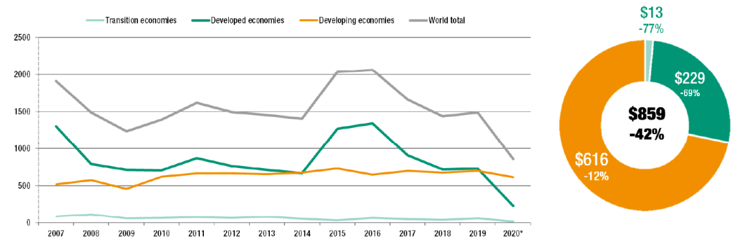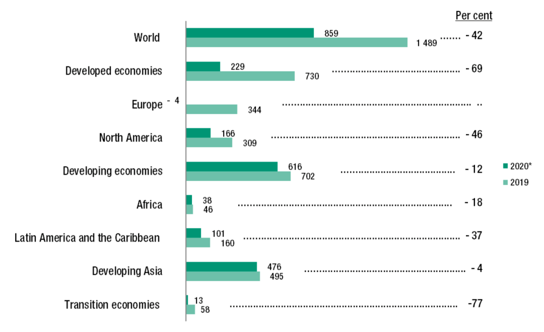 2021年1月,聯(lián)合國貿(mào)易與發(fā)展會(huì)議組織發(fā)布了第38份《全球投資趨勢(shì)監(jiān)測(cè)》。報(bào)告顯示,因新冠肺炎疫情和美國政治局勢(shì)不明等因素的影響,2020年全球外國直接投資(FDI)急劇下挫,從2019年的1.5萬億美元直接下跌到了8,590億美元,跌幅達(dá)42%之巨。截至2020年底,外國直接投資的水平比2009年全球金融危機(jī)后的谷底還要低30%以上,回落至上世紀(jì)90年代的水平。