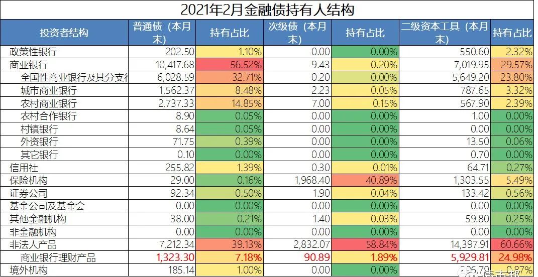 再來看看金融債的持有人,二級資本債的持有人還是以銀行理財、基金、券商資管等非法人產品為主,占比超過了60%,其中銀行理財持有25%,還不至于一家獨大。