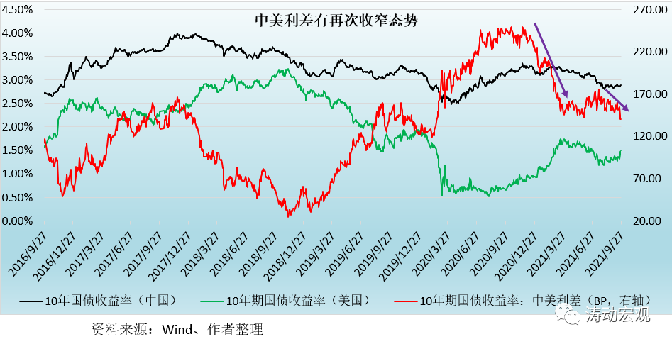 4、國內經濟下行壓力有一定凸顯,特別是考慮到今年上半年基數較高、經濟周期開始由修復階段重新掉頭向下等因素,今年四季度和明年上半年的經濟基本面均不支持市場利率上行,因此中美利差在國內因素的帶動下也傾向于收窄。
