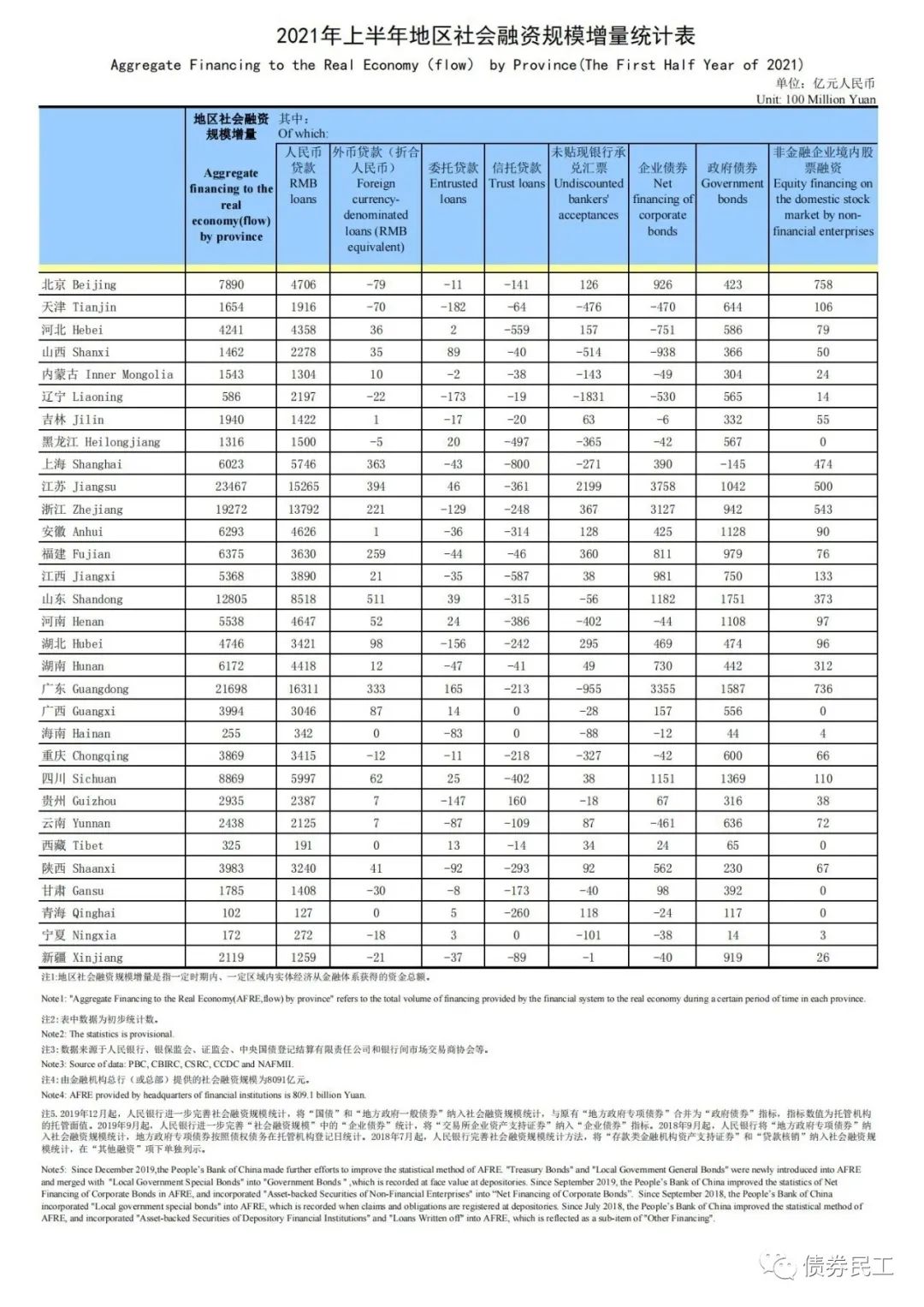 中國人民銀行于2021年8月2日披露了《2021年上半年地區社會融資規模增量統計表》,表中詳細披露了各個省市的債券融資增量情況(包括企業債券、公司債券和非金融企業債務融資工具等)。其中部分數據還是需要特別關注的,具體數據情況詳見下表: