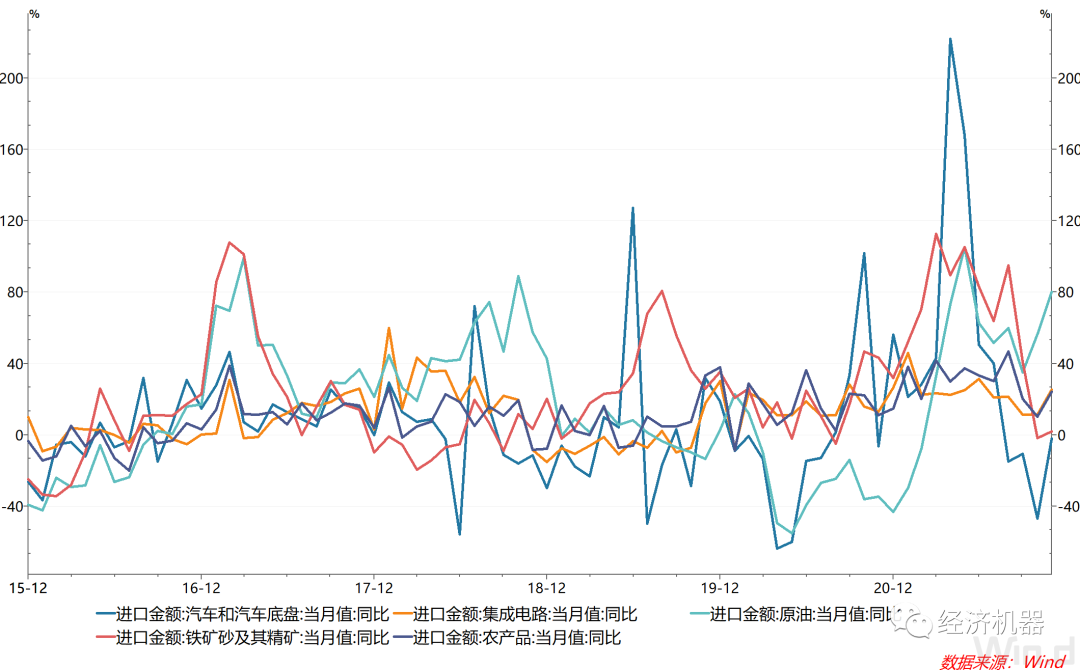 此外,隨著能源短缺的緩解,生產(chǎn)恢復也帶動了進口需求。上中下游(如汽車、集成電路、原油、農(nóng)產(chǎn)品等)進口增速均有不同程度的提升(圖2)。