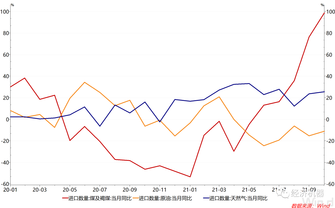 進口表現(xiàn)大幅超預期。11月,我國進口2538.1億美元,同比增長31.7%,較上月提升11.1個百分點,遠高于預期的18.2%。這或許得益于我國能源保供政策的強力推進。10月份以來,我國加快對煤炭等大宗商品進口的清關(guān)速度,以緩解國內(nèi)能源短缺。11月,我國進口煤約3500萬噸,環(huán)比增長30.11%,同比增長98.7%(圖1)。能源保供下,部分大宗商品進口暴增,或許是進口超預期的重要推動因素。