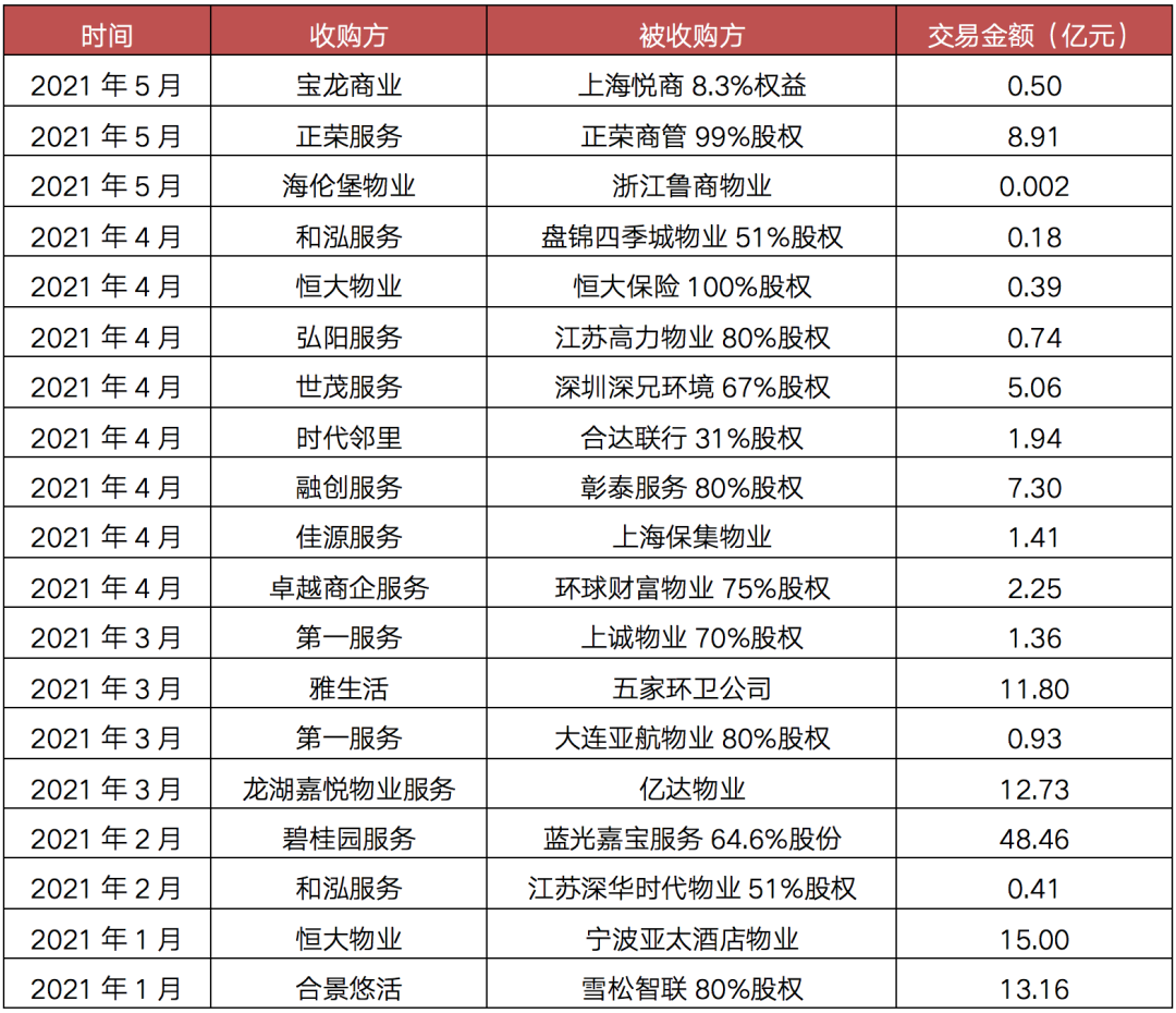 數據顯示,2021年以來物管行業的收并購熱度高漲,中小型收購事件持續不斷,據不完全統計,2021年至今物管行業的收并購事件總交易金額就已經接近133億元,超過2020年全年的100億元。