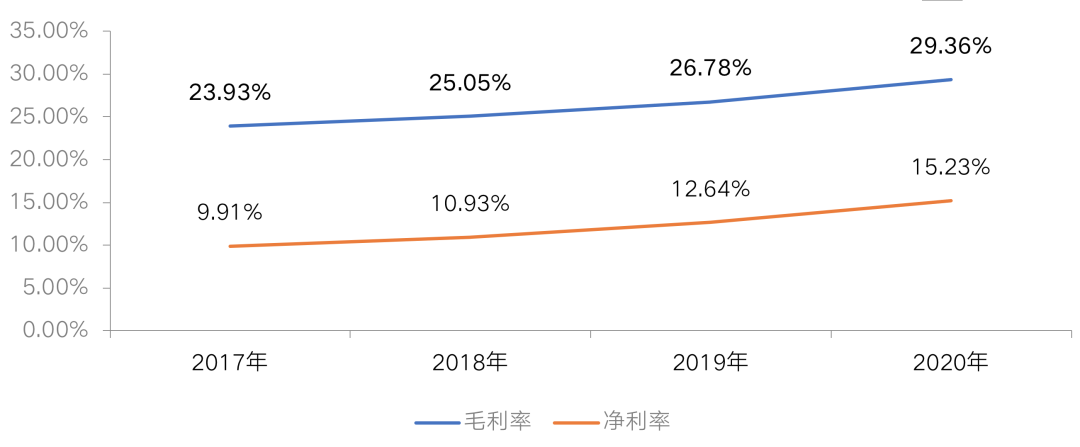 近年來,隨著整個房地產行業規模見頂,相比傳統地產開發,物管行業現金流穩健,經營風險相對較低,同時盈利能力也較為穩定。從目前上市的物管企業2017-2020年的加權平均毛利率和凈利率來看,近年來物管行業的毛利率和凈利率都保持著穩步上升的態勢。與此同時,據CRIC監測,2020年典型上市房企的毛利率下降4.8個百分點至24.3%,凈利率也已下降至10%。