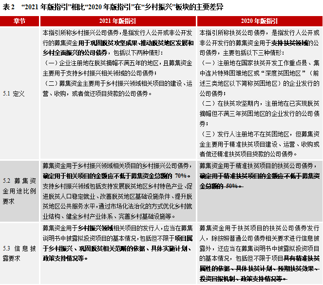 2021年版指引主要修訂以下內(nèi)容:一是給出鄉(xiāng)村振興公司債券的發(fā)行要求,即企業(yè)注冊(cè)地在脫貧摘帽不滿五年的地區(qū),且募集資金主要用于支持鄉(xiāng)村振興相關(guān)領(lǐng)域的公司債券,或主要用于鄉(xiāng)村振興領(lǐng)域相關(guān)項(xiàng)目的建設(shè)、運(yùn)營(yíng)、收購(gòu),或者償還項(xiàng)目貸款的公司債券;二是提升資金使用比例,確定用于相關(guān)項(xiàng)目的金額應(yīng)不低于募集資金總額的 70%,較扶貧債券使用比例提升20%;三是明確資金使用范圍,鄉(xiāng)村振興債應(yīng)支持發(fā)展脫貧地區(qū)鄉(xiāng)村特色產(chǎn)業(yè)、促進(jìn)脫貧人口穩(wěn)定就業(yè)、改善脫貧地區(qū)基礎(chǔ)設(shè)施條件、提升脫貧地區(qū)公共服務(wù)水平,通過(guò)市場(chǎng)化法治化的方式優(yōu)化鄉(xiāng)村就業(yè)結(jié)構(gòu)、健全鄉(xiāng)村產(chǎn)業(yè)體系、完善鄉(xiāng)村基礎(chǔ)設(shè)施等。