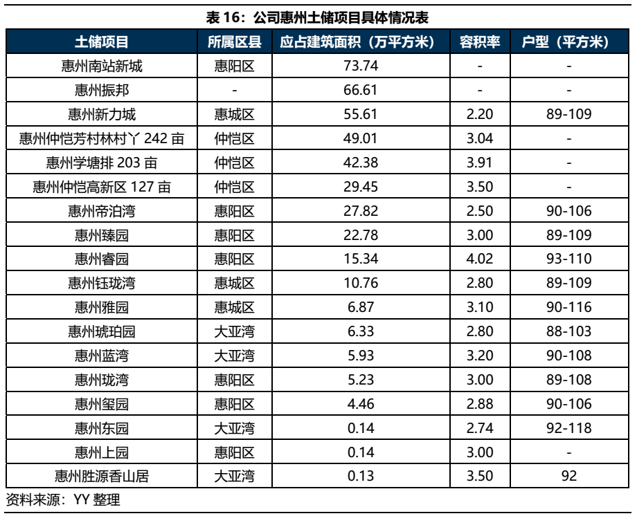 公司在惠州的項目整體容積率偏高,大多在2.8以上,且戶型面積主要在88-110平方米之間,樓盤品牌主要為“園”和“灣”,沒有高端品牌“悅”,(公司品牌“園”、“灣”、“悅”分別對應剛需、改善、高端住房需求)??梢姽驹诨葜莸亩ㄎ恢饕獌A向于剛需群體。