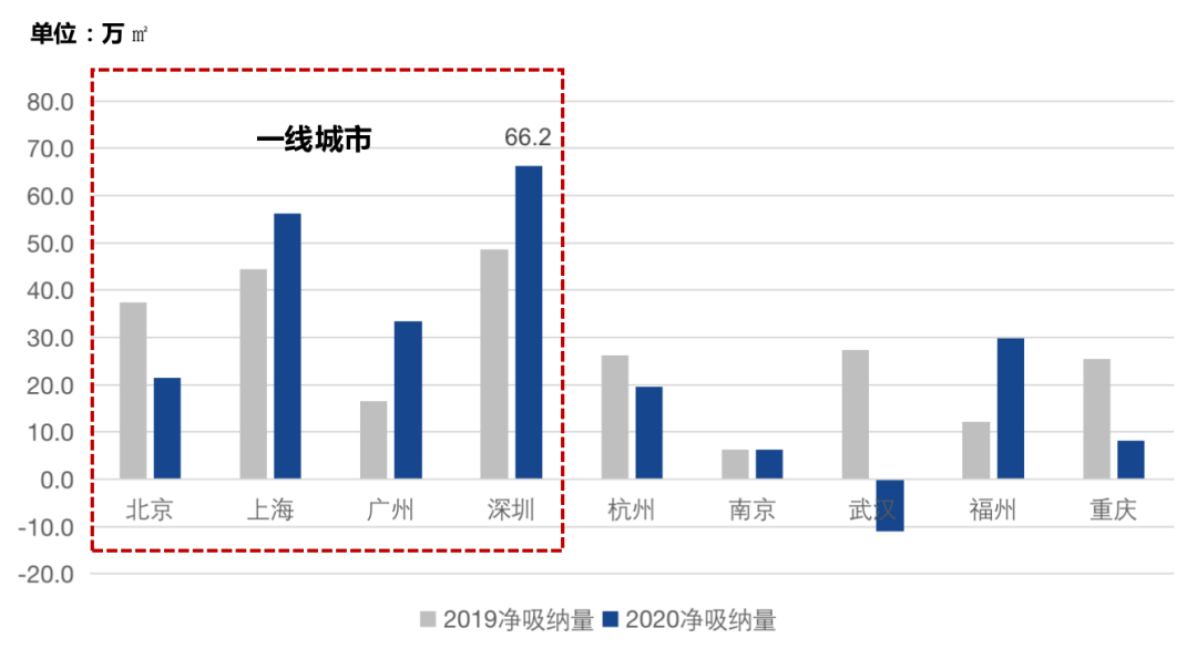圖:2019-2020重點城市寫字樓凈吸納量