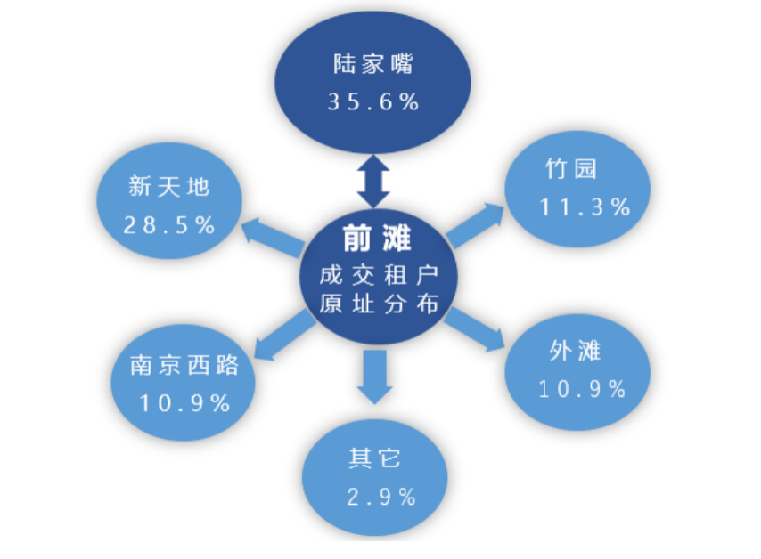 前灘商務區在2020年表現亮眼,不僅局限于新設企業租戶,對其他傳統商務區的吸附效應也較為明顯,全年上海大面積(≥8000㎡)成交租戶中,前灘商務區占比近一半。