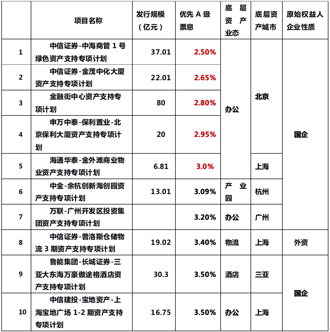 在“靈活穩健”的貨幣政策總基調下,央行多次釋放流動性呵護市場。疫情背景下,機構的投資策略則趨于保守,大量資金涌向國企一線城市核心地段優質辦公資產ABS產品。按ABS優先A級產品發行票息由低到高排行,發行票息最低的前5位均為一線城市核心地段國企辦公資產,發行利率均不高于3%。而在發行票息最低的TOP10存量資產ABS產品中,辦公資產占據了7席,均為一線城市核心區域優質辦公資產,發行主體方面,國企更是占據9席,“優質主體“+“優質資產”的雙保險成為市場資金的“最優選擇”。