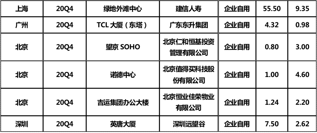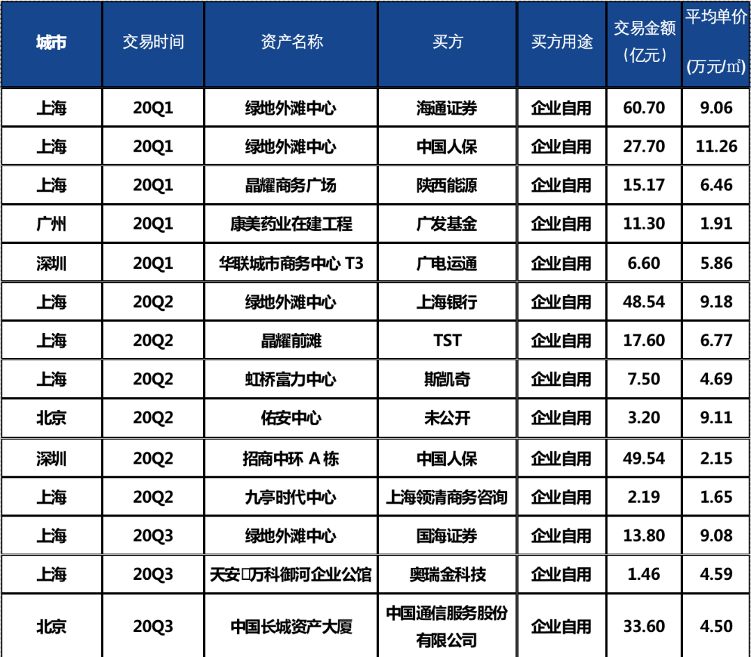 因企業自用需求產生的交易較往年成倍增長,迎來高峰: 一方面現金流充足的企業看準市場的窗口期以較合理的價格購入優質資產,可以實現投資長期的保值增值;另一方面在總部經濟的熱點效應下,企業應對新形勢調整發展戰略,重塑企業架構,整合性遷址或擴租。