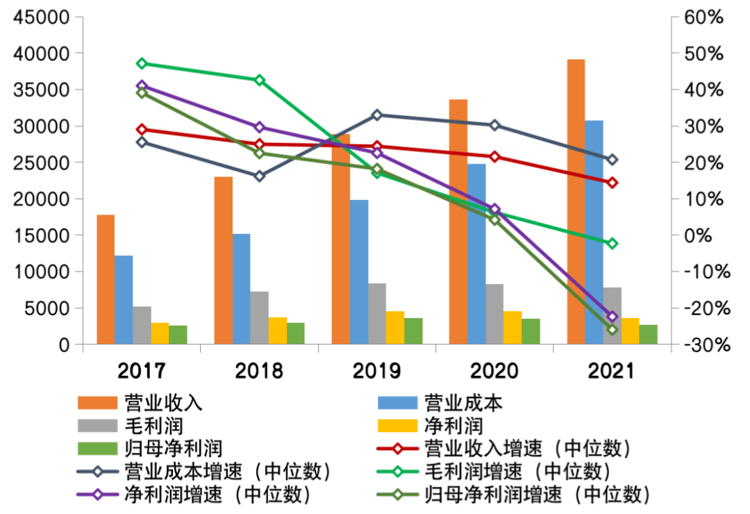 在營收和營業(yè)成本增速不匹配的擠壓下,行業(yè)利潤增速放緩,直至出現(xiàn)負(fù)增長。