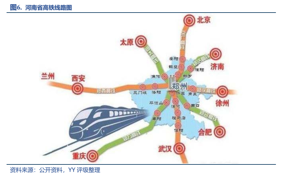 河南鐵路通車里程居全國第一,三橫五縱的鐵路網(wǎng)絡在此交匯,而鄭州作為京廣、隴海線的交匯點,素有中國鐵路心臟之稱,因此河南的高鐵建設基本也是以鄭州為核心,延省內(nèi)各市鋪展而開,整體呈現(xiàn)米字型,有“橫”貫東西的徐蘭高鐵,“豎”連南北的京廣高鐵,“撇”望中原的鄭萬高鐵,“捺”指江南的鄭合高鐵,以及“點”通西北的鄭太、鄭濟(尚未開通)高鐵。另外中歐班列(鄭州)輻射30多個國家130多個城市,加大了開放的力度。