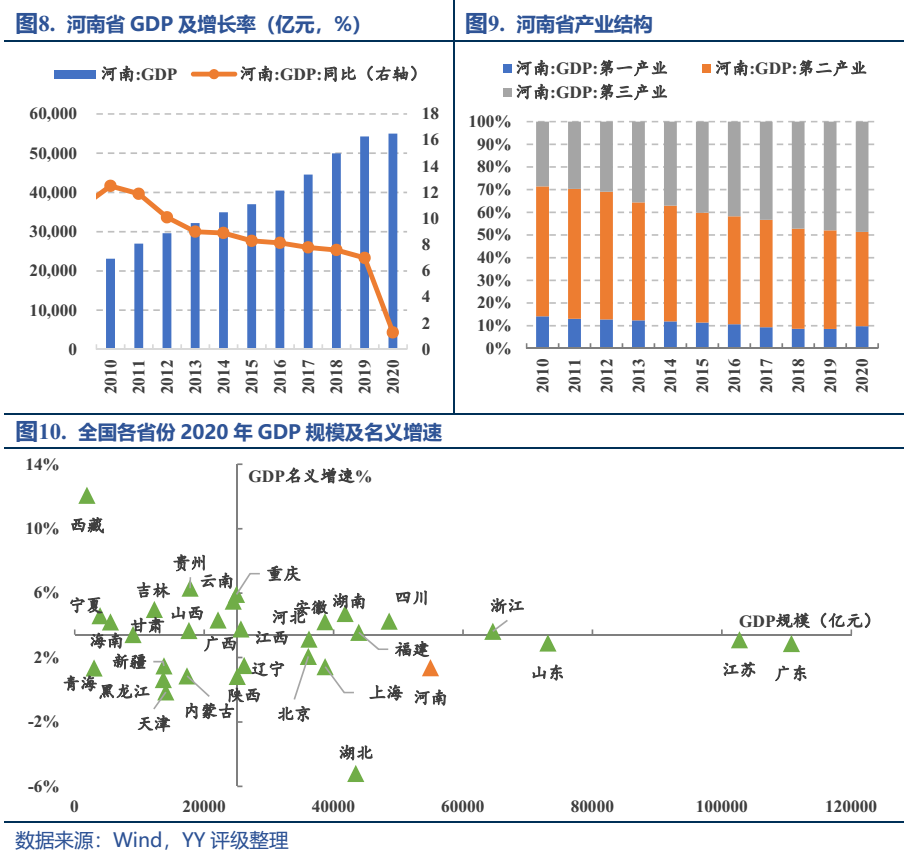 河南2020年GDP(54,997.07億元)在全國排名第五,但人均GDP較低,且增速折戟,可比增長率僅1.30%,遠低于全國平均水平2.30%。