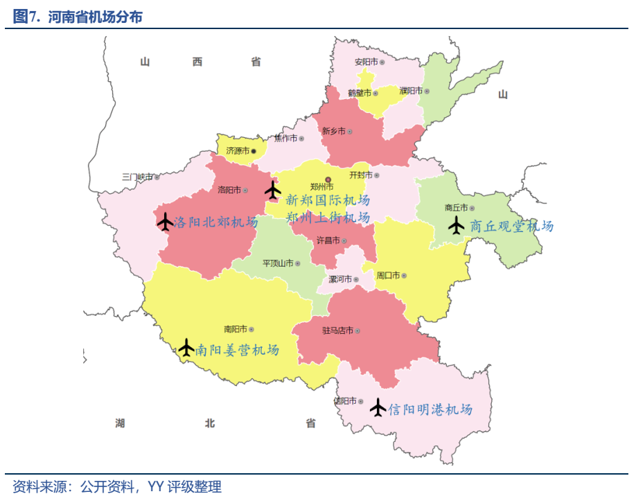 除了密集交錯的鐵路、公路線外,地處內(nèi)陸的河南為了走出去,2013年建立了鄭州航空港經(jīng)濟綜合實驗區(qū),開始了問天要路的發(fā)展之旅。航空港區(qū)內(nèi)的新鄭機場作為中國八大區(qū)域性樞紐機場之一,借助于港區(qū)強大的手機終端生產(chǎn)能力,在貨郵吞吐量中排名全國第七;同時2.5小時的航空圈可覆蓋全國人口的90%,旅客吞吐量排名全國十二,航空樞紐地位顯著。另外除了新鄭,省內(nèi)還有其他5個機場分別位于洛陽、南陽、商丘、信陽,完善補充了全省的航空體系。